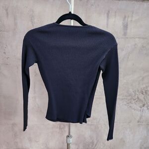 long sleeve, very stretchy, thick, ribbed cross front shirt. Gently preloved condition. Any flaws will be noted.