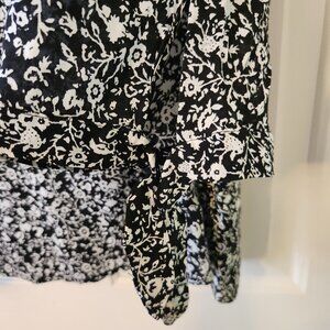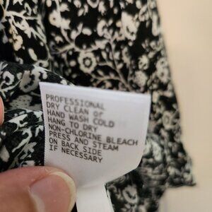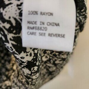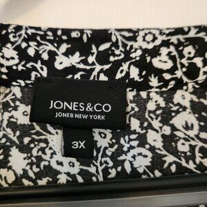 This is an adorable Jones & Co. rayon top. It is black & white floral with a tie detail at the end of the 3/4 sleeve. It is about an 1" +/- longer in the back for additional coverage. It has been worn a couple of times but is in excellent condition. This top travels really well, so if you are going on a trip, this piece is an excellent choice. It is also perfect for day at the office. This Jones New York/Jones Co top is a size 3x and it is rayon, so its best hand washed. My home is non-smoking. Thanks for looking.
