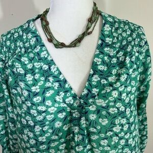 Very pretty silky feel blouse in a pretty green with tiny white flowers Long sleeves with ruching and a ruffle at sleeve edge. There is ruching on the top front of the blouse also. The front drops down to a V. with a pleat at the bottom of the V. Measurements are pit to pit flatfold about 21 1/2”. The total length of the blouse from to to hem is about 28”. No visible flaws. Questions please ask and we will answer ASAP