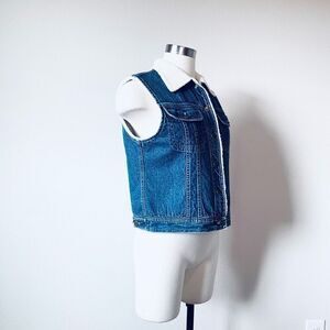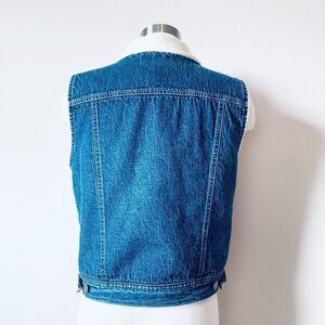 Vintage Jones Jeans sleeveless Sherpa denim vest. This vest is a medium wash denim, buttons down the front, and has front pockets.