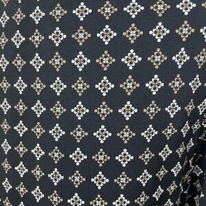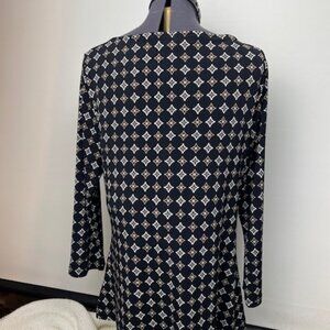 Jones NY Cinch Waist Polyester Print Top. 3/4 sleeve, Black Tan White geometric design. Very Good used condition. Waist accenting