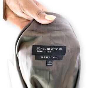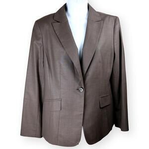 Jones NY Collection Borwn Womens Stretch Blazer 10. Classic business blazer, single breasted, single notched collar. Lightweight for spring or fall. Single button closure. Pockets are still stitched shut, excellent used condition. 60% wool, 38% polyester, 2% spandex. Dry clean only.