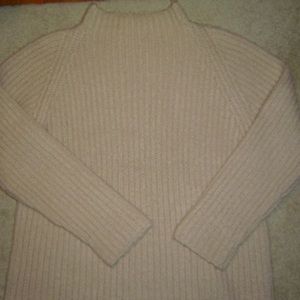 Gorgeous chunky boyfriend sweater in camel with a boxy slightly oversized fit, mock neck and raglan sleeves. Classic style and heavy weight wool blend means this sweater has lots of life left! Pairs well with high waist skinny jeans and booties. Size Medium Chest 21", sleeves (underarm to cuff) 17", length 23"