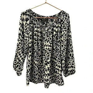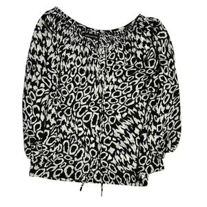Light weight material, peasant style blouse with elastic cinched neck line.