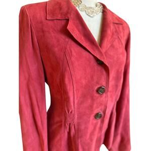 Such a pretty blazer jacket that can be paired with both jeans, pants or a skirt. Made of 100% soft leather that has the appearance of suede. This jacket is fully lined, has a 3-button closure and ruching in the lower back to cinch in the waist once closed. The color is a cross between a pink-red.