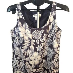 Jones New York sleeveless maxi dress in a rich navy blue with an all-over white tropical floral print. Made from 100% linen, this lightweight and breathable dress is perfect for warm-weather outings or resort wear. Features a classic scoop neckline and a long, flowy silhouette.