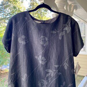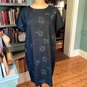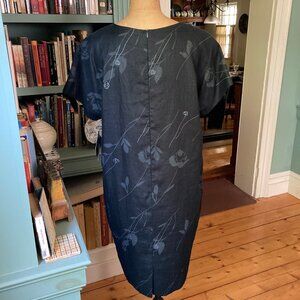 Simple box-cut shift with kimono short sleeves. An invisible zipper at the back, and a back vent at the hem. Thin shoulder pads add slight structure. Linen fabric has a black background with a botanic graphic in grey and white. Fully lined in black poly. Marked size 14; but shown here on a size 12 mannequin. New with tags attached.