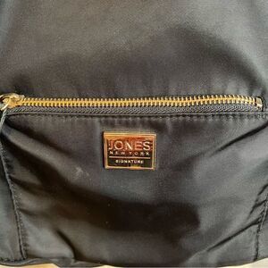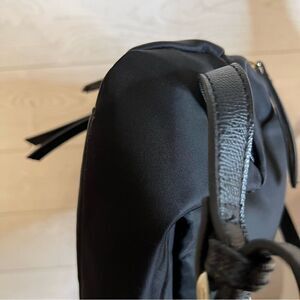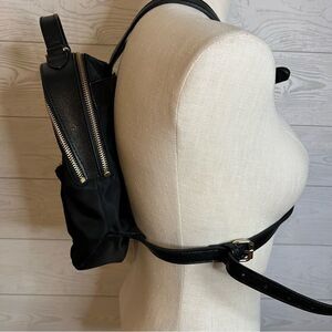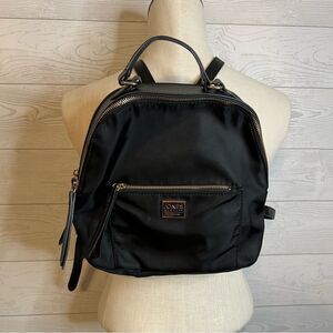 Stylish black backpack. Features front zip pocket. Durable and sleek design.