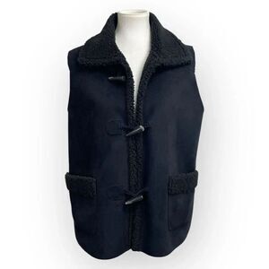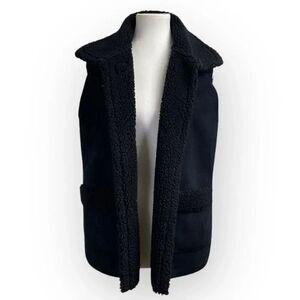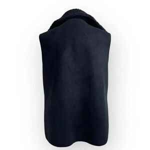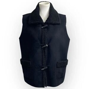 Black Faux Suede Vest with a faux sherpa lining. Toggle button closure. Women's size XL. Pockets with fleece trim detail.