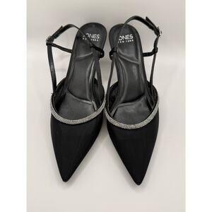 Step out in elegant comfort with these never-worn Jones New York heels. Designed with a pointed toe and subtle mesh detailing, they feature a sparkling rhinestone trim for a chic finish. The low heel makes them perfect for long wear—ideal for events, evenings out, or dressing up your workwear.