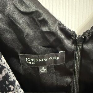 Jones New York dress, size 12. Featuring a black and silver faux-sequin print (the shimmer effect is printed, not actual sequins). Designed with pleated layers details across the bodice and waist for a flattering fit.