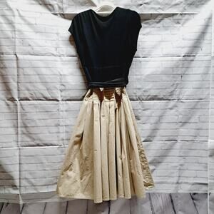 Jones New York Black Tan Wrap Top Pleated skirt Dress. Preowned, EUC, see all the pictures as part of the description. The dress has a wrap top that slips into side tabs. The Skirt part is a heavier material and is very gathered/pleated. I think its from late 90's or early Y2k