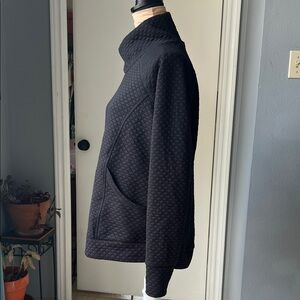 Elegant black cowl neck sweater with textured design. Ideal for warmth and style.