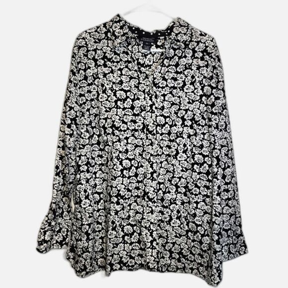 Jones New York Black White Floral Button Up Top 2X
