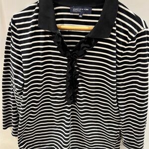Chic blouse with bold stripes and a ruffled collar. Ideal for versatile styling.
