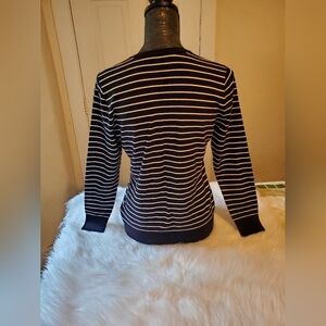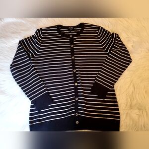 Chic black cardigan with white stripes. Button-up front. Ideal for layering.