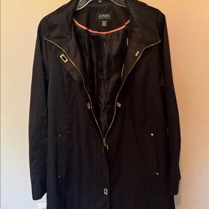 Elegant black rain coat with sleek design. Features front zip closure with button overlay . Ideal for versatile styling.
