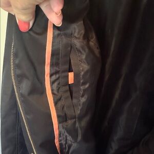 Lined, two side pockets and one inner hidden pocket. Has a hidden zipper under the collar for a good (not imcluded).