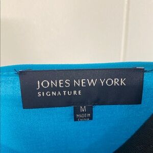 Keywords: Jones New York blouse, cap sleeve, v-neck, turquoise blue, epaulet shoulders, signature collection, professional blouse, work wear, business casual, summer blouse, sleeveless top, career wear, office fashion, bright blue, tailored fit, polyester blend, wrinkle resistant