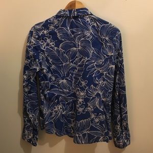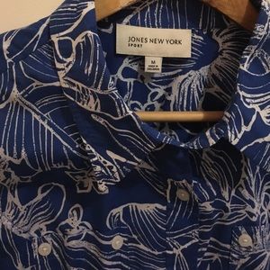 New Jones of New York Blouse. A vibrant blue with tropical white detail. This 100% cotton top has a little stretch for pure comfort while tailored to fit the female body perfectly.