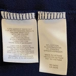 JONES New York Signature navy blue cotton jersey jacket with sleeves that show a nautical white polka dot pattern around cuffs when rolled up