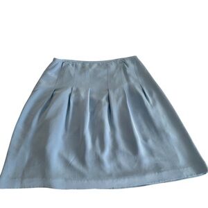 This elegant blue pleated skirt by Jones New York is designed for both work and casual occasions. Featuring a knee-length cut and pleated style, it offers a sophisticated silhouette that complements any wardrobe. Six sewn down pleats in front and back. Hidden side zipper with hook and loop closure. A-line. Hidden hem. Fully lined. 100% Silk. Size 16. Color: Easter Egg Blue. Dry cleaned 3-5-2025. Small spot on front. Noted in pictures.