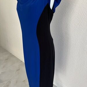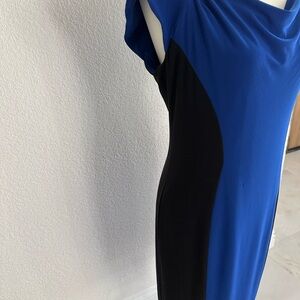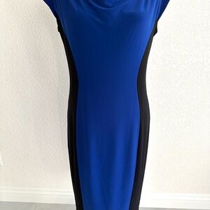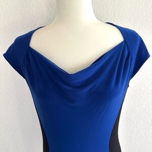 This is a sophisticated and figure-flattering colorblock sheath dress: