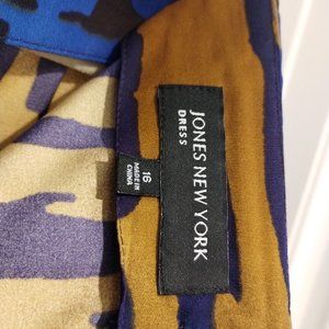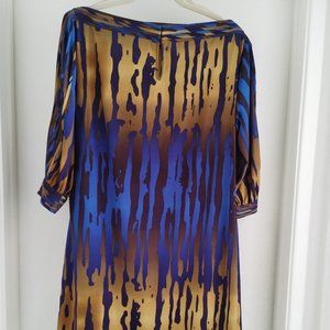 GORGEOUS colors - much more so that images can do justice. Gold/brown, blue and black. Wonderful drape. Jones New York, boatneck shift dress with 3/4 sleeves. Sleeves have narrow flat pleats, as does the neck and cuffs. Condition is excellent.