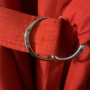 Chic Vibrant Red 100% Silk button down shirt dress with side slits by Jones New York. Pointed collar with short sleeves accented with silver buckles. A matching silver buckle belt at the waist. Luxurious feel with a modern touch on a classic style.