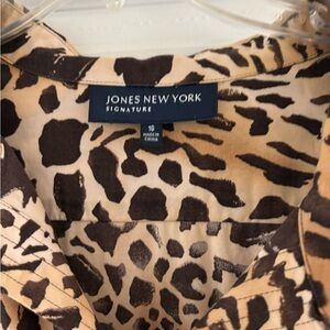 This stylish dress from Jones New York features a chic v-neck and a notched collar, perfect for a casual night out. The wrap design in brown and tan leopard print adds a touch of sophistication, while the short sleeves offer a relaxed fit. Crafted from a soft, flowing fabric, this dress ensures comfort and elegance. This dress buttons up the front. Smoke-free home!