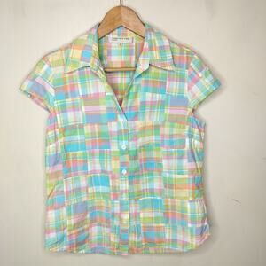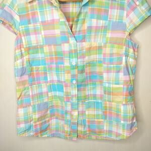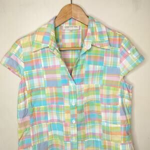 JNY madras patchwork plaid cotton cap sleeve button up shirt. Size M. 100% cotton. (22549)