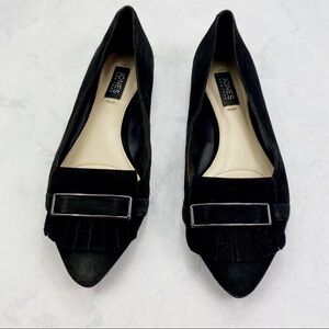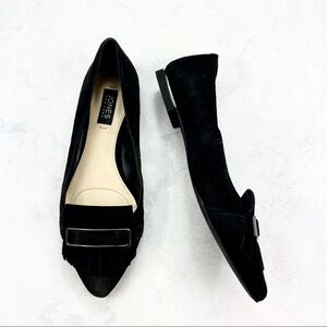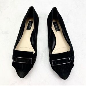 Jones New York Classic Black Fringe Flats. Pointed Toe. Metal Piece in Front. Slip-On Style. Solid Black Color. Minor Fading / Scuffs. Super Cute & Comfy. No Stains or Rips.