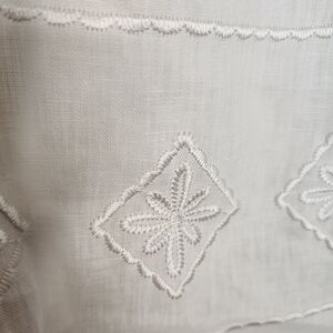 White linen fabric with tonal embroidery on the hem. Side invisible zipper. Full flared A-line cut. Lined.