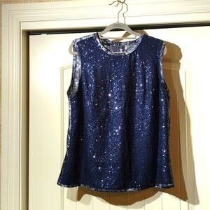 Jones New York Collection Navy Sequin Snakeskin Print Trim & Back Tank Size 14. Zip up back. Lined front. Pre-owned, this tank is in excellent condition and just in time for the holidays. Pair it with a Navy blazer with gold buttons and jeans, and you have an amazing look!