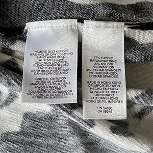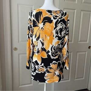 Jones New York Pullover Tunic Sweater. Black, white and yellow/gold floral print with scoop neck and 3/4 sleeves. A stunning piece when paired with black or white! This Rayon/Nylon/Lycra blend drapes beautifully for a figure-flattering look. Rayon has nice breathability making this a great sweater from summer into all seasons. Wrinkle-resistant fabric is ideal for travel. Dress it up with slacks or a skirt, add a bit of sophistication to a pair of jeans, or wear it with shorts or capris on vacation! Very versatile options make this a great addition to your wardrobe.