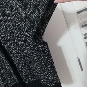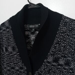 JONES NEW YORK COLLECTION SHORT SLEEVE BLACK White SUPER STRETCHY COLLARED 1 BUTTON CROPPED CARDIGAN SWEATER. SOLID BLACK TRIM WIDE HEM A OVERSIZE COLLAR.