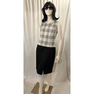 The bodice is black and white houndstooth plaid and the skirt lower half of the dress is black. Dart stitching around the neckline and the lower waist of the bodice. Slit right above the knee. Shift dress, excellent condition, size, 10. Check out my closet for more trendy and vintage items! You can be assured of quality and authenticity. Accessories sold separately in my closet.