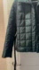 This is a quilted puffer jacket from the brand Jones New York. It is a women's jacket in a dark, shimmering, iridescent green color. The jacket has a button-up front closure and a stand-up collar. It features a self-tie belt around the waist and long sleeves. It is described as a stylish jacket suitable for fall and spring weather. The shell is made of polyester.