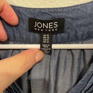 Chic denim blue blouse by Jones New York. Features elegant lace trim on sleeves and neckline. Perfect for casual or dressy occasions.