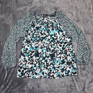Jones New York Floral Print Tassel Peasant Blouse Black Teal White Size Large