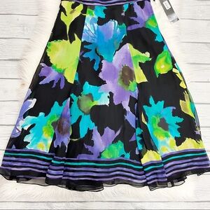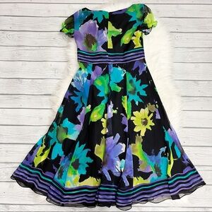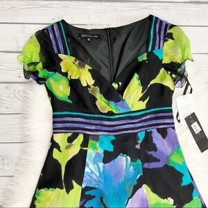 New with tags! Floral dress from Jones New York. Features v-neck, shorts sleeves with ruffle detail and hidden back zip closure. Fully lined. Size 2 petite