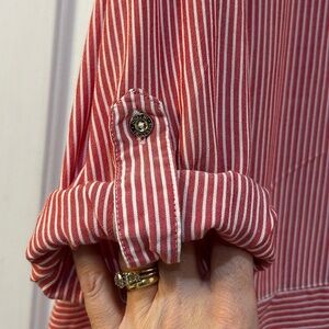 Embrace effortless style with the Jones New York Flowy Tunic Blouse, a perfect blend of comfort and elegance for your wardrobe. Sized at 1X, this relaxed-fit blouse features a classic collared neckline and versatile long sleeves with roll tab details, allowing for a customizable look that transitions smoothly from business to casual settings. The striking red viscose material, lightweight and breathable, is designed for all-season wear, ensuring you stay comfortable whether it's a breezy day at the beach or a cozy evening indoors. With its vibrant striped pattern, this blouse hints at a nautical theme with a touch of preppy charm, making it an ideal choice for those who appreciate a splash of color in their ensemble. It's machine washable for easy care, and the button accents add a subtle accent to the piece. Whether you're dressing for travel, a casual outing, or a professional environment, this Jones New York tunic will serve as a stylish and functional foundation for any look.