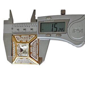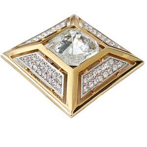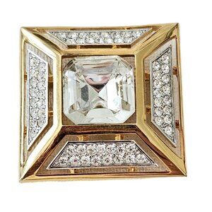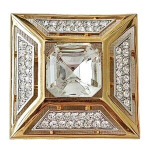 Wear this remarkable Jones New York Square Brooch for an elevated look. The geometric shape and form of this pin will substantially make a statement piece. It features a square-shaped pin with an openwork frame design in a radiant gold tone with a polished finish. The silver-tone components on the four sides are decorated with pave-set clear rhinestones. The centerpiece is a big squared-shaped clear rhinestone that exhibits shining facets that perfectly complement the gold tone base, creating a striking contrast that will certainly capture attention and admiration. It measures 1.5 inches in length. Marked JONES NEW YORK on the reverse, finished with a secure locking pin that functions properly. A great addition to your brooch collection.