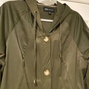 Classic and versatile Jones New York hooded utility jacket in an olive green shade: