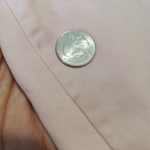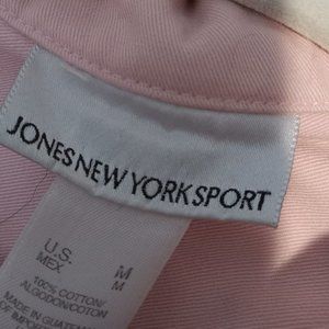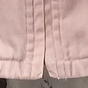 Light Pink Zip front Jones New York Jean Jacket. Front Pockets, adjustable waist buttons. Has a small spot at bottom of zipper and another. See pics.