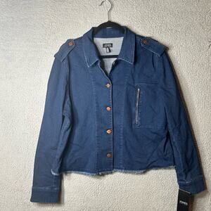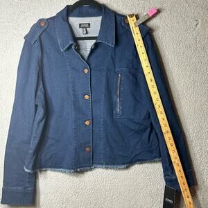 Jones New York Jean Jacket Womens XL Blue Denim Jacket Cropped Raw Hem Zip Pocket New