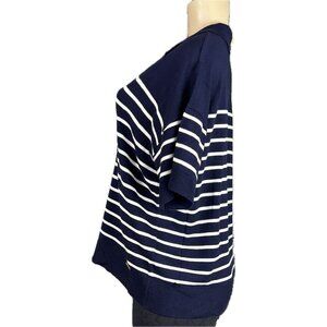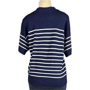 ITEM: Jones New York Signature L Navy/White Striped Split Neck Collar Ribbed Trim Short Sleeve Polo Sweater
