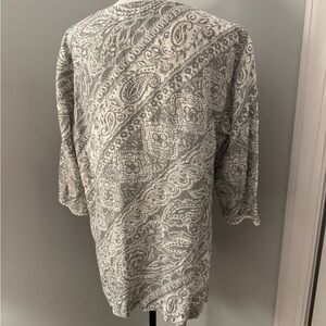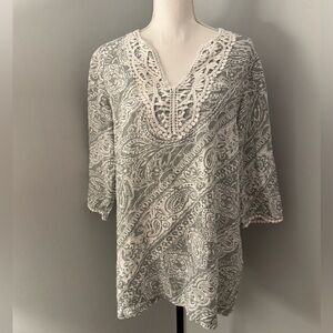 Jones New York Linen Blouse with Lovely Crochet Detailing. 3/4 sleeves Gray/white Size Large