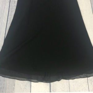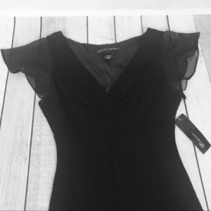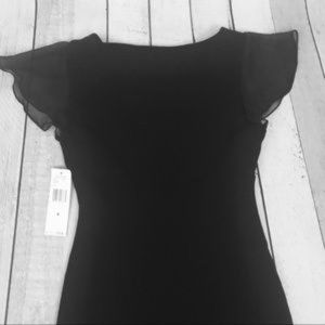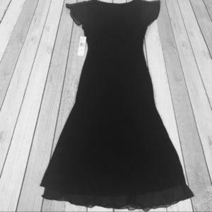 New with Tags Jones New York Little Black Dress with Silk Ruffle Cap Sleeves and Hem Line. V-Neck with pleated bust. Super elegant and versatile. Body is 100% polyester, Trim is 100% Silk. Easy pull on style. Fully lined. Tag size 4. Approximate measurements laying flat: armpit to armpit 16”, waist 13”, length shoulder to hem 47”.