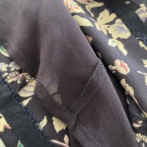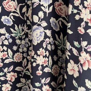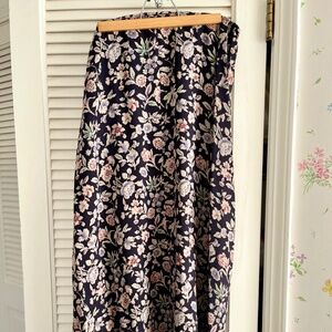 EUC -- This coordinated blouse and A-line skirt have the lovely drape and flow of silk. The skirt is lined in black silk as well; unlined short-sleeve blouse. The blouse has small shoulder pads for shaping, but they're merely tacked in at the ends, so easily removed. With the skirt at a midi length, this conservative outfit is appropriate for church or office. This is labeled as a woman petite.